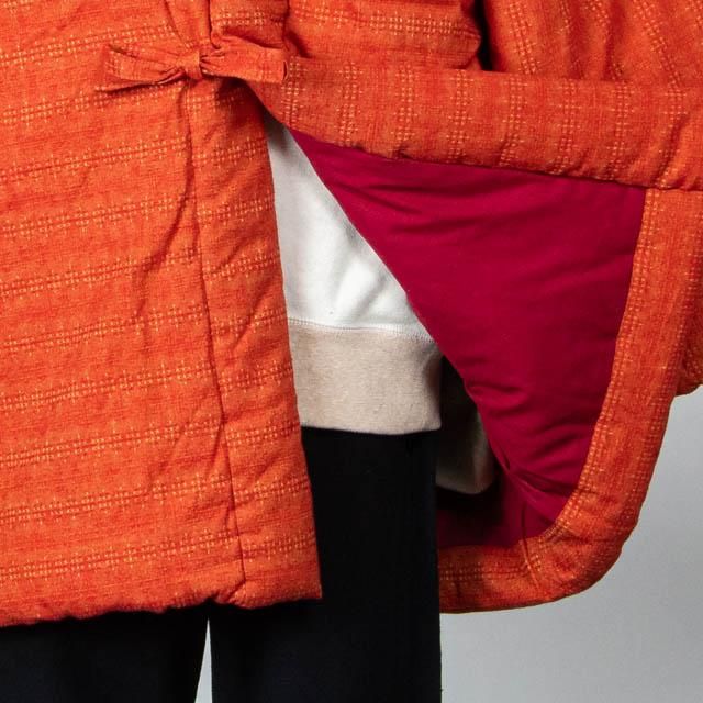通常のわた入れはんてんは、前が突き合わせとなっておりますが、この「ちょい合わせ」は、衿幅の広さ分の重なりを施し、暖かさを少しでも逃しにくくしています。
