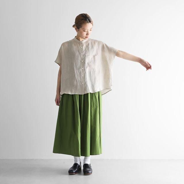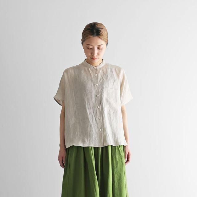 HUISさんのシャトルリネンライトバンドカラー半袖ワイドブラウスです。