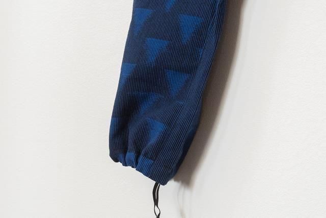 大小の「まる」「さんかく」「しかく」が散りばめられた久留米絣MONPEです。久留米絣の柄や模様は、できた生地の上に柄をのせるプリントなどとは異なり、織る前の糸を染め分ける「先染め」で生み出すのが特徴です。糸をくくって、染めて、解いて、染め分けた部分で柄を表現するという技法で、独特のかすれたような模様になります。