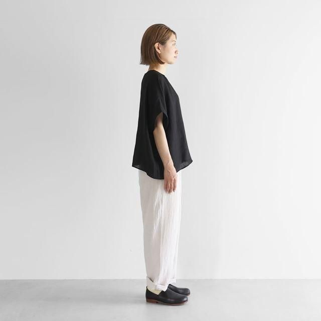 シャトル織機で織られたリネン100%の特別な生地【シャトルリネン】よりも薄手で軽く、麻60番手をタテヨコに使用した【シャトルリネンライト】をたっぷり使っています。透け感がある生地で、春夏シーズンにぴったりの涼やかなアイテムです。