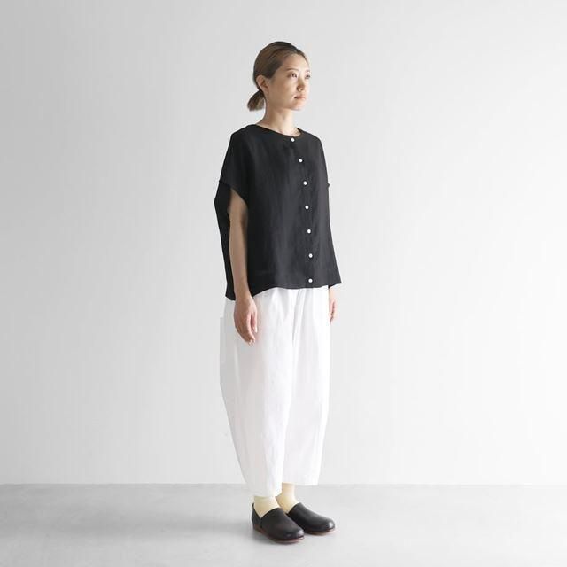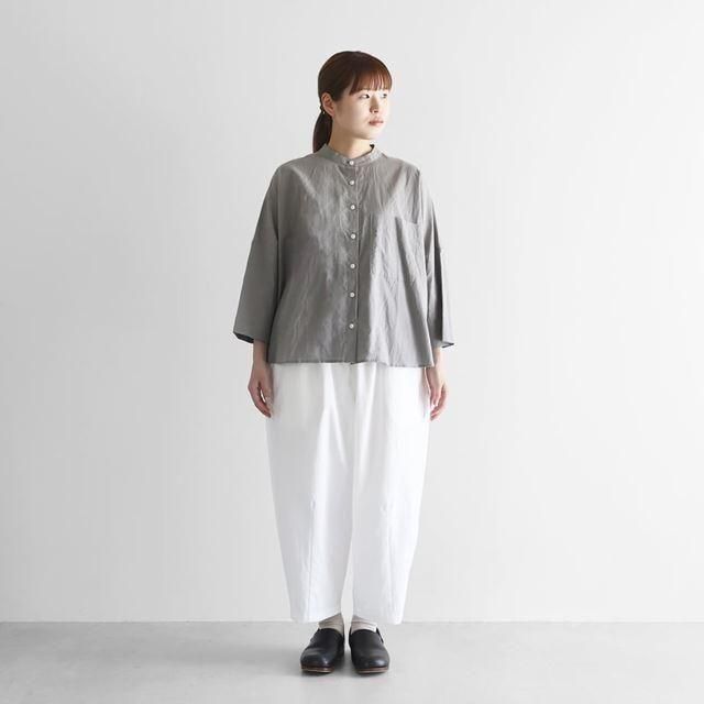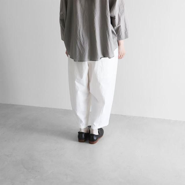もも周りにたっぷりと生地を使用したバルーンパンツで、裾に向けてテーパードがかかったきれいなラインのシルエットです。8〜9分丈くらいの丈感で、少しロールアップして履いていただくのもおすすめです。右後ろについた下がり気味のポケットがポイント。