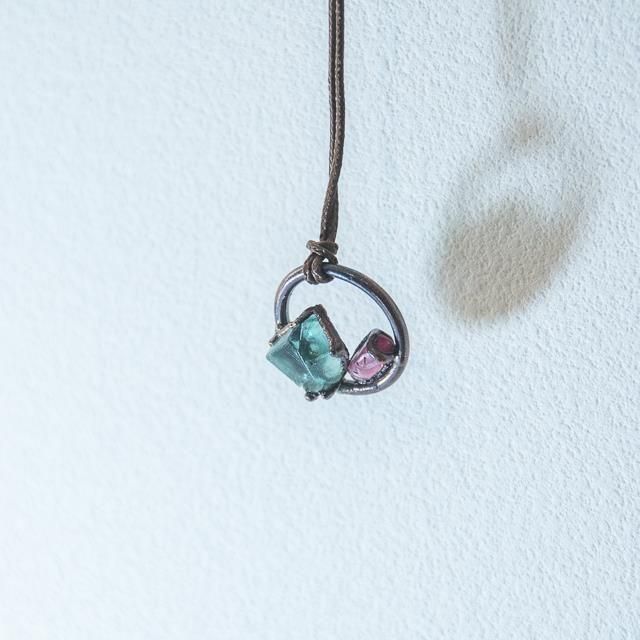 岡山で天然石アクセサリを制作されるpibicoさんのフローライト X ロードライトガーネット 原石 ペンダントネックレス 192です。
