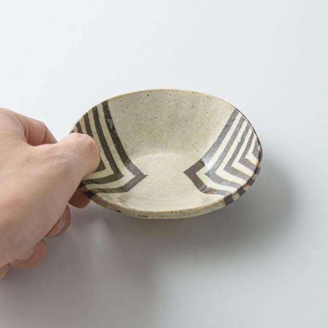 鳥取県で作陶されている牧谷窯、杉本義訓さんの練り込み楕円鉢 小です。